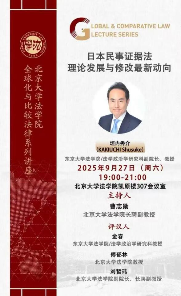 On September 27, 2025, Professor KAKIUCHI Shusuke, Vice Dean and Professor of the Graduate School of Law and Politics, The University of Tokyo, was invited to serve as the keynote speaker for the”Globalization and Comparative Law Lecture Series”and delivered an academic lecture entitled Theoretical Development and Latest Trends in Revisions of Japan's Civil Evidence Law.