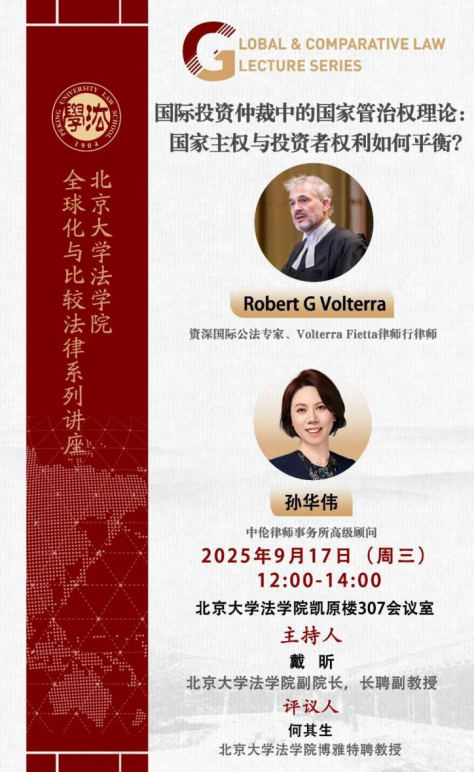 On September 17, 2025, Mr. Robert G. Volterra, a senior public international law expert from Volterra Fietta law firm, and Mr. Sun Huawei, a senior consultant from Zhong Lun Law Firm, delivered an academic lecture at Peking University Law School entitled”The Theory of State Regulatory Power in International Investment Arbitration: National Sovereignty and Investment”. The lecture was hosted by Dai Xin, Vice Dean and Tenured Associate Professor of Peking University Law School, with He Qisheng, Boya Distinguished Professor of Peking University Law School, serving as the commentator. Attracting a large number of faculty, students, and researchers from both on and off campus, the lecture featured enthusiastic on-site discussions and received a positive response.