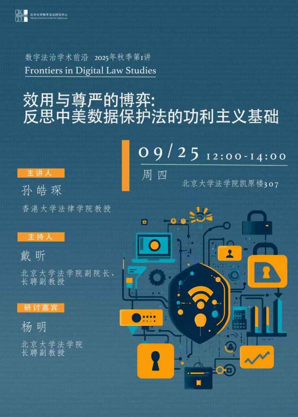 At noon on September 25, 2025, Professor Sun Haochen from the Faculty of Law, The University of Hong Kong (HKU), served as the guest speaker for the”Digital Rule of Law Academic Frontiers” Lecture Series and delivered an academic lecture entitled “Tension Between Utility and Dignity: Rethinking the Utilitarian Foundation of Data Protection Laws in China and the United States”. The lecture was hosted by Dai Xin, Vice Dean and Tenured Associate Professor of Peking University Law School (PKU Law), with Yang Ming, Tenured Associate Professor of PKU Law, acting as the discussant. Many faculty members and students participated in the on-site exchanges, creating a lively atmosphere.